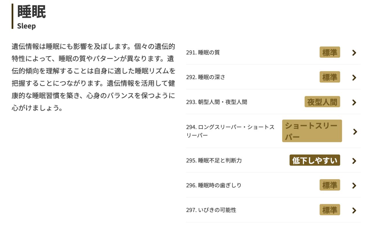 - 睡眠関連: 睡眠の深さやリズムに関する遺伝的傾向、推奨される睡眠時間の手がかりなど。
