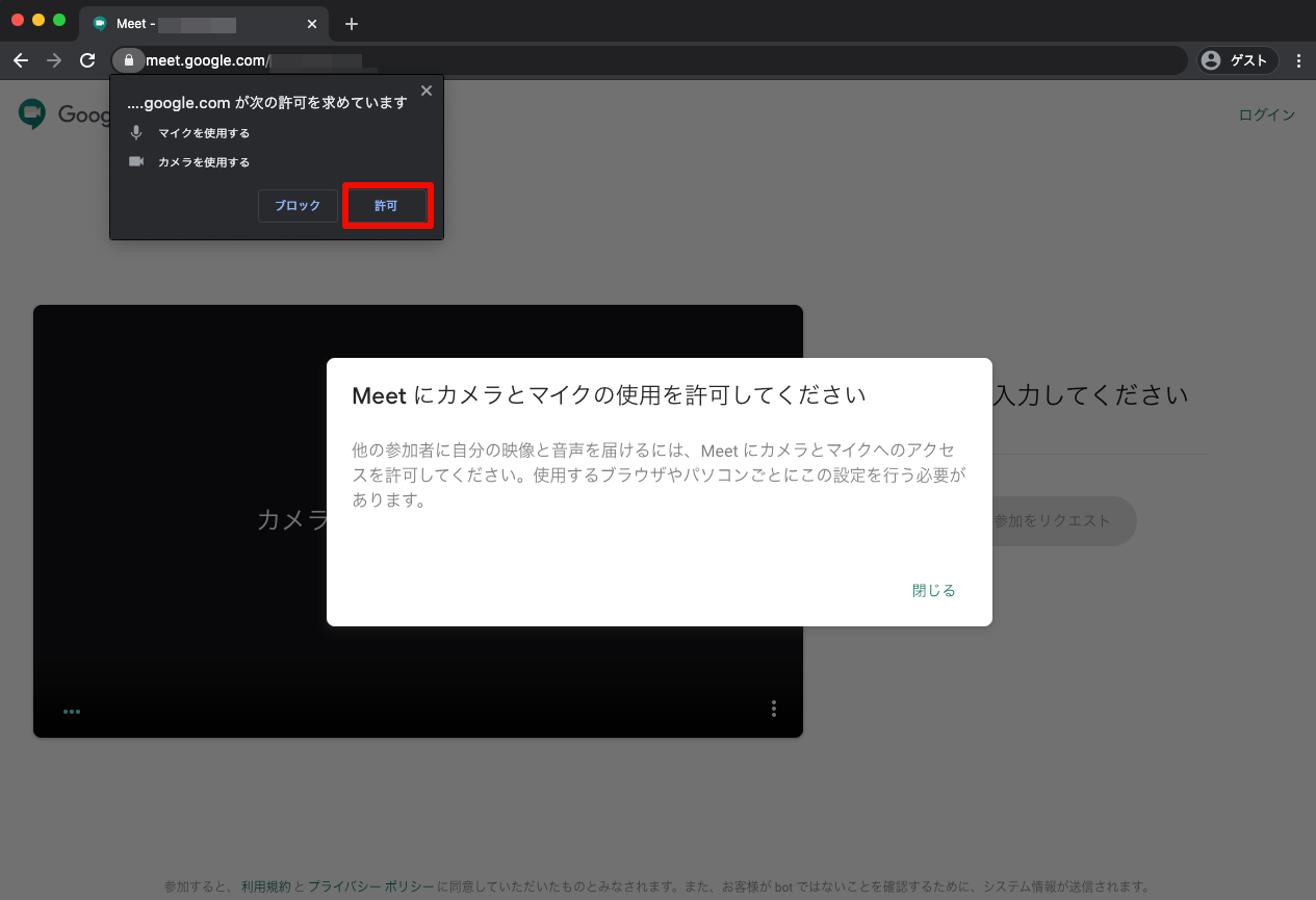 画面に「マイクとカメラの使用を許可しますか?」という表示が出たら、「許可」を押してください。